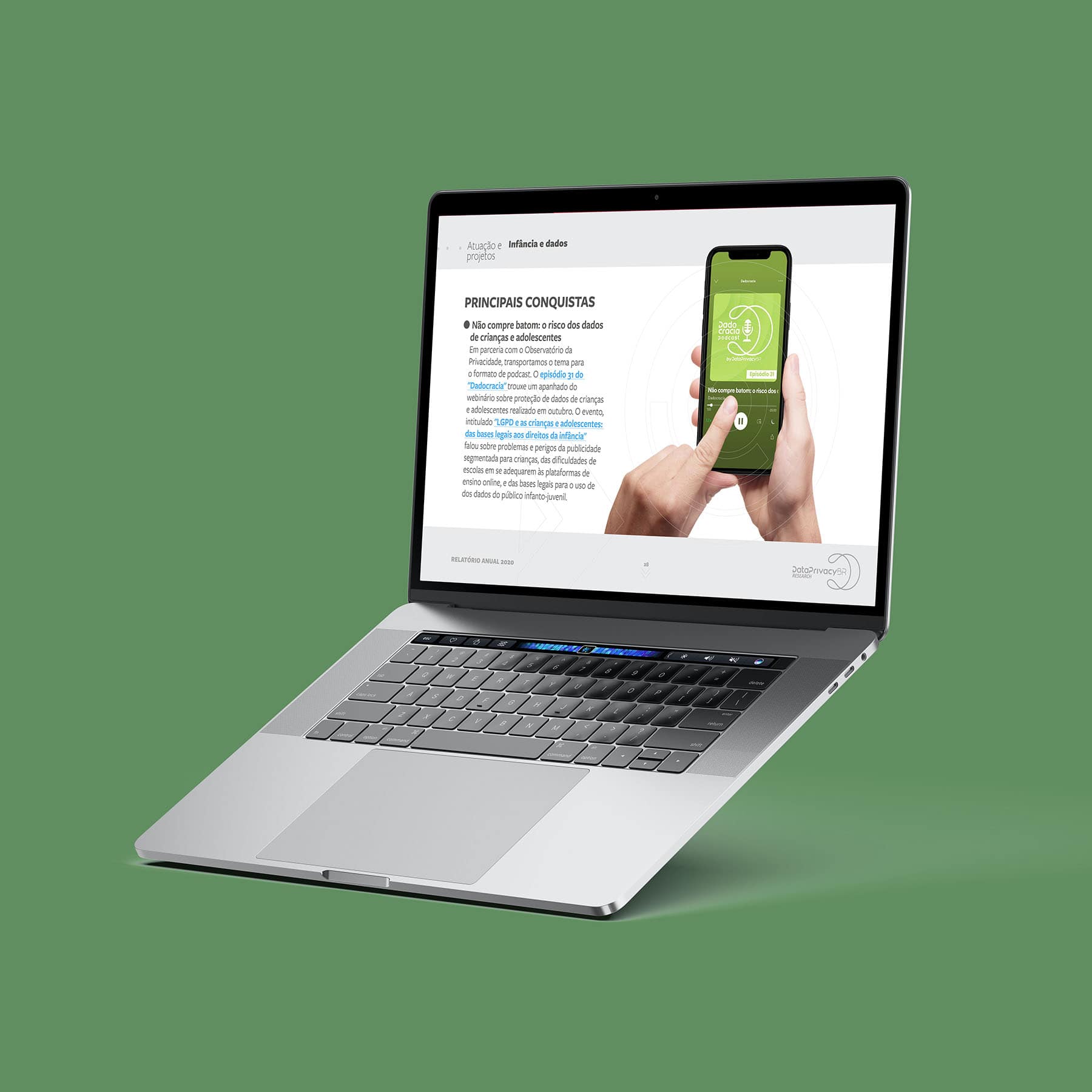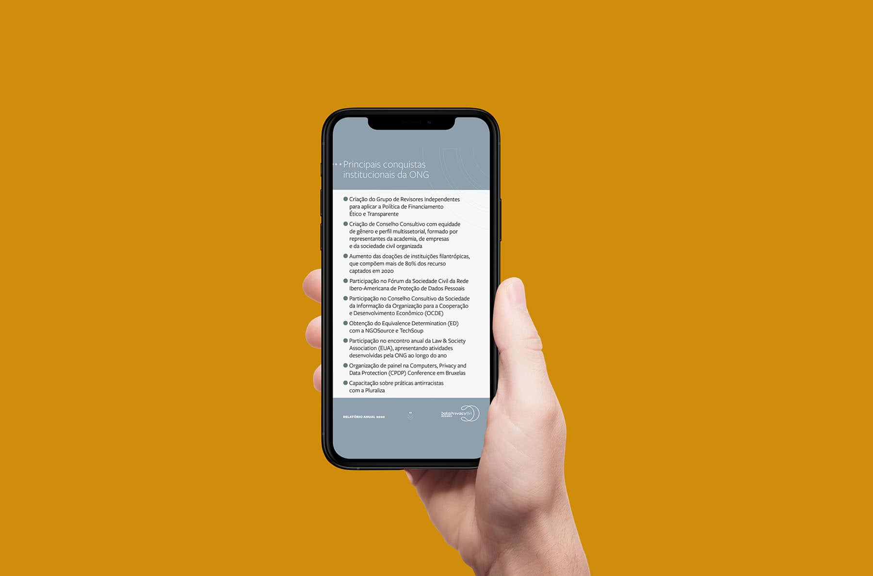 Criamos o design do Relatório Anual da Associação Data Privacy Brasil de Pesquisa. O projeto foi feito em dois formatos, um especial para telas de celulares e outro para telas computadores, respeitando as proporções de legibilidade para cada um dos dispositivos. O material foi dividido em quatro grandes blocos: Quem Somos, Atuação e Projetos, Um Olhar para o Futuro e Governança/Financeiro. O resultado foi um relatório interativo, com links para diversos conteúdos como lives, e-books e vídeos.