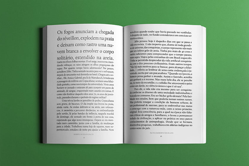 Projeto gráfico e diagramação do livro em formato digital Pacto, do escritor, jornalista e professor Roberto Nicolato. O e-book está disponível gratuitamente para download em PDF ou EPUB. As ilustrações são de Robson Vilalba. Nicolato também é autor do livro de poesias Pequeno tratado do amor e da natureza e dos romances Do outro lado da rua e A caminhada ou O homem sem passado.